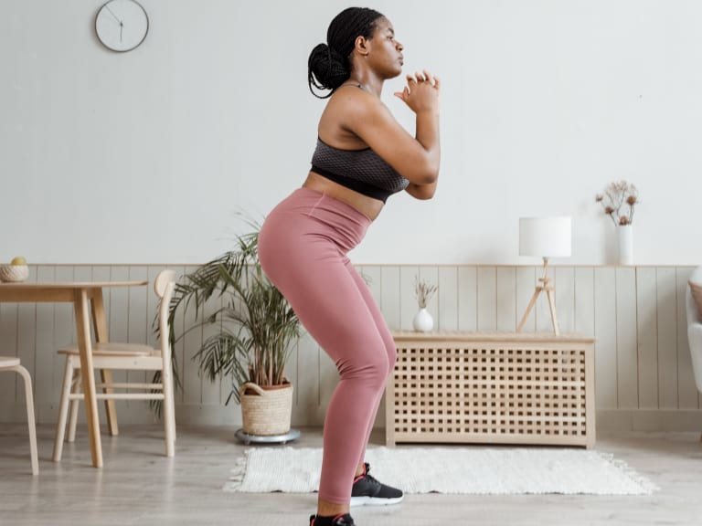 Im Englischen werden Kniebeugen als Squats bezeichnet. Sie stärken die gesamte Körpermuskulatur und sorgen für Stabilität in der Körpermitte. So führst Du Squats richtig aus: Hände vor der Brust aneinander, Füße schulterbreit auseinander, Beine leicht beugen, Po nach hinten schieben, in die Knie gehen – so, als würde man sich auf einen unsichtbaren Stuhl setzen wollen. In dieser gebeugten Haltung hält man die Muskelspannung einige Sekunden, bis man wieder in die Ausgangsposition zurückkehrt – und die Auf- und Abwärtsbewegungen mehrmals wiederholt. Wer den Schwierigkeitsgrad erhöhen will, kann Pistol Squats – einbeinige Kniebeugen – ausführen. So oder so verbrennt man schon bei fünf Minuten Kniebeugen bis zu 50 kcal.*